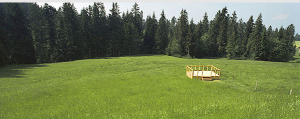 ZUM TANZ :: 2003, Klanginstallation, Zusammenarbeit mit Peter Allamand (Tanzbühne/2,5x4m aus Holz, beweglicher Tanzboden löst Töne an Akkordeons aus, die unter dem Tanzboden installiert sind) vom klangraum heiligkreuz 2003, einer Ausstellung mit Klanginstallationen und Klangaktionen 29.6.-19.10.03 in Heiligkreuz, Entlebuch.